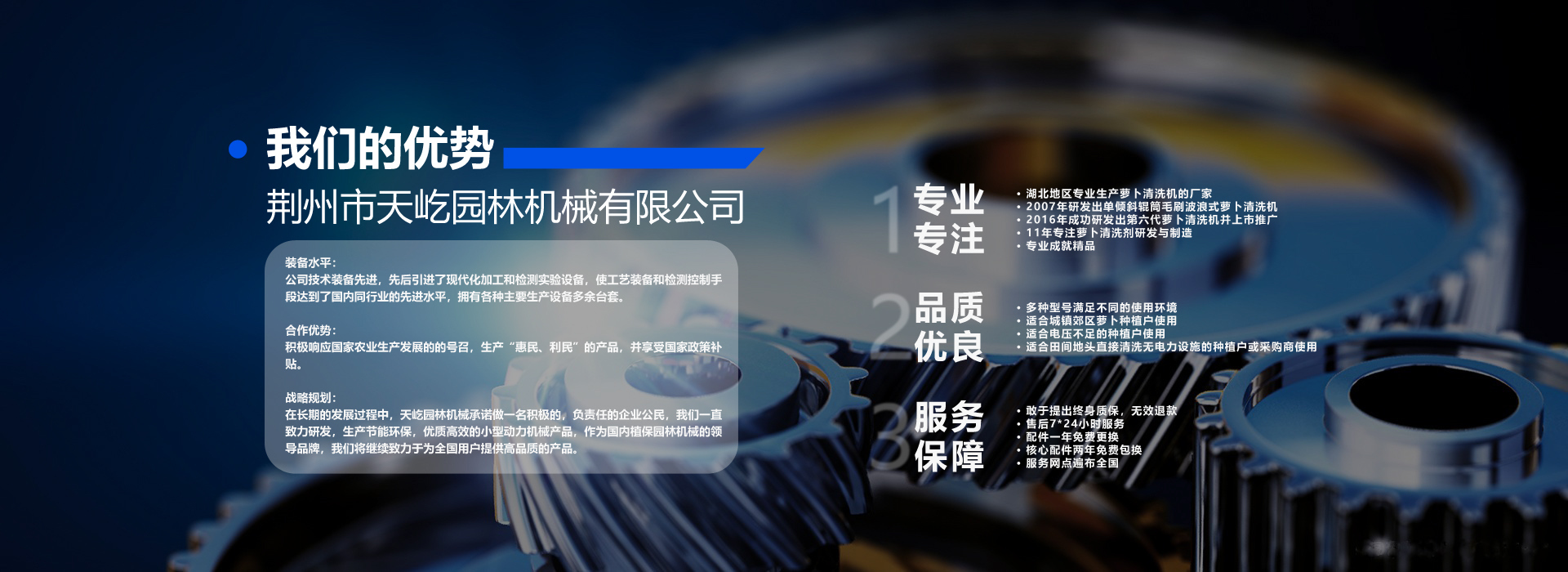 荊州市天屹園林機(jī)械有限公司坐落于歷史文化名城湖北省荊州市荊州區(qū)。本公司是一家從事小型機(jī)械動(dòng)力產(chǎn)品研發(fā)、生產(chǎn)的獨(dú)資民營(yíng)企業(yè)。公司注冊(cè)資金500萬(wàn)元,現(xiàn)有員工60余人、公司在全國(guó)多個(gè)省市區(qū)設(shè)有多家經(jīng)銷(xiāo)和服務(wù)點(diǎn),在國(guó)內(nèi)創(chuàng)“售前培訓(xùn)、產(chǎn)品銷(xiāo)售、配件供應(yīng)、售后服務(wù)”四位一體的營(yíng)銷(xiāo)模式。專(zhuān)門(mén)配備售后服務(wù)車(chē),設(shè)立售后服務(wù)備件庫(kù),以在第一時(shí)間滿(mǎn)足用戶(hù)的不同需求。 經(jīng)營(yíng)范圍:果蔬清洗機(jī)(白蘿卜清洗機(jī),胡蘿卜清洗機(jī);荸薺清洗機(jī);土豆清洗機(jī);冬瓜清洗機(jī);生姜清洗機(jī)等)。公司主要產(chǎn)品有園林機(jī)械、植保機(jī)械等,其中公司以蘿卜清洗機(jī)系列占主導(dǎo)地位。銷(xiāo)售網(wǎng)絡(luò)及售后服務(wù)遍布國(guó)內(nèi)多個(gè)省市。 裝備水平:公司技術(shù)裝備先進(jìn),先后引進(jìn)了現(xiàn)代化加工和檢測(cè)實(shí)驗(yàn)設(shè)備,使工藝裝備和檢測(cè)控制手段達(dá)到了國(guó)內(nèi)同行業(yè)的先進(jìn)水平,擁有各種主要生產(chǎn)設(shè)備多余臺(tái)套。 合作優(yōu)勢(shì):積極響應(yīng)國(guó)家農(nóng)業(yè)生產(chǎn)發(fā)展的的號(hào)召,生產(chǎn)“惠民、利民”的產(chǎn)品,并享受?chē)?guó)家政策補(bǔ)貼。 戰(zhàn)略規(guī)劃:在長(zhǎng)期的發(fā)展過(guò)程中,天屹園林機(jī)械承諾做一名積極的,負(fù)責(zé)任的企業(yè)公民,我們一直致力研發(fā),生產(chǎn)節(jié)能環(huán)保,優(yōu)質(zhì)高效的小型動(dòng)力機(jī)械產(chǎn)品,作為國(guó)內(nèi)植保園林機(jī)械的領(lǐng)導(dǎo)品牌,我們將繼續(xù)致力于為全國(guó)用戶(hù)提供優(yōu)質(zhì)的產(chǎn)品。 MORE